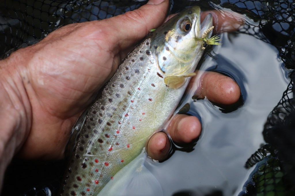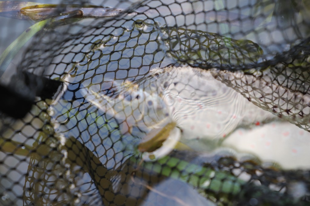 As the slender bar of gold and silver nears the bank I lower my net, holding the rod up high to shorten the distance. The strange billowing mesh lurking in the reeds spooks the fish and with renewed vigour it makes two last desperate runs, forcing me to reposition and angle the rod to reign it in, directing it back toward me. Eventually after a valiant effort the fish tires and I am able to slide its microscopically scaled body across the surface and into the net. Confident that it’s secured I place the rod on the bank and lay down to examine this jewel of the river. Every time I catch wild brown trout I am struck with awe at their beauty. Perfectly mottled to blend into their aquatic environment and intricately marked as if hand painted, each one unique. Splashes of black dots punctuated by vivid red circles adorn its flanks. The dark metallic shimmer on their backs lightening subtly down to a buttery yellow belly and delicate translucent fins boldly outlined in white. I leave it in the net while I admire and appreciate this perfectly evolved wonder before gently removing the fly from the corner of its mouth and letting it rest and regain its strength in the revitalizing flow of moving water. Long moments pass before rapid, energetic flicks of the tail tell me its ready to go. I dip the net and with careful hands direct it to freedom. With a flash its gone, melting quickly back into the gravel bottom below.