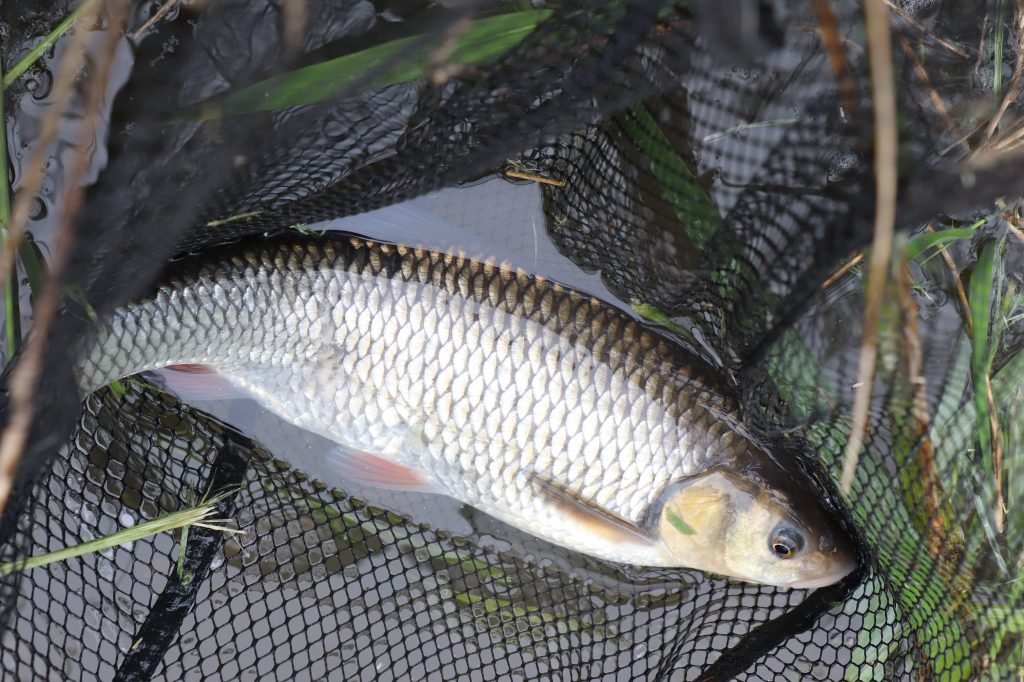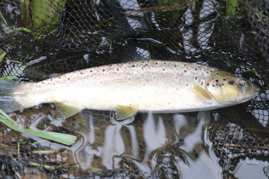 The portly chub soon realises that resistance is futile and I muscle the girthy fish into the bank in short order, eager to get it out of the way and get my fly back over the feeding trout. Red fins and shimmering scales weigh heavy in the net as I haul it up to unhook the spritely lump. Although this wasn’t my target species it is a good fish, pushing four pounds and in great condition. After a few moments of recovery in the submerged mesh, it tastes freedom and swims off sulkily down river while I get reorganised. My fly is wet but still presentable and the leader unscathed so, blowing the damp feathers dry, I hold fire until I see another rise. I don’t have to wait long and soon my fly is sailing through the air, probing upstream before being delivered once again to the calm surface of the water. The ripples as it lands have barely dissipated when, for a second time the fly is engulfed by a hungry fish. I don’t have to wonder at the culprit on this occasion as the eager trout gets airborne in its effort to secure what it thinks is another easy meal. This is what I have been waiting for! I can see in the fraction of a second that the fish is out of the water that it is a nice sized wild fish by Rother standards. Lifting the rod firmly I set the hook and the surprised fish once again leaps from the water, shaking bodily to try and rid itself of the fly. The barbless hook holds fast under the pressure from the tight line. With baited breath and an elevated heart rate, I start to gingerly ease the fish in, letting it run when it wants to and regaining line with every chance I get. Forcing myself not to rush.