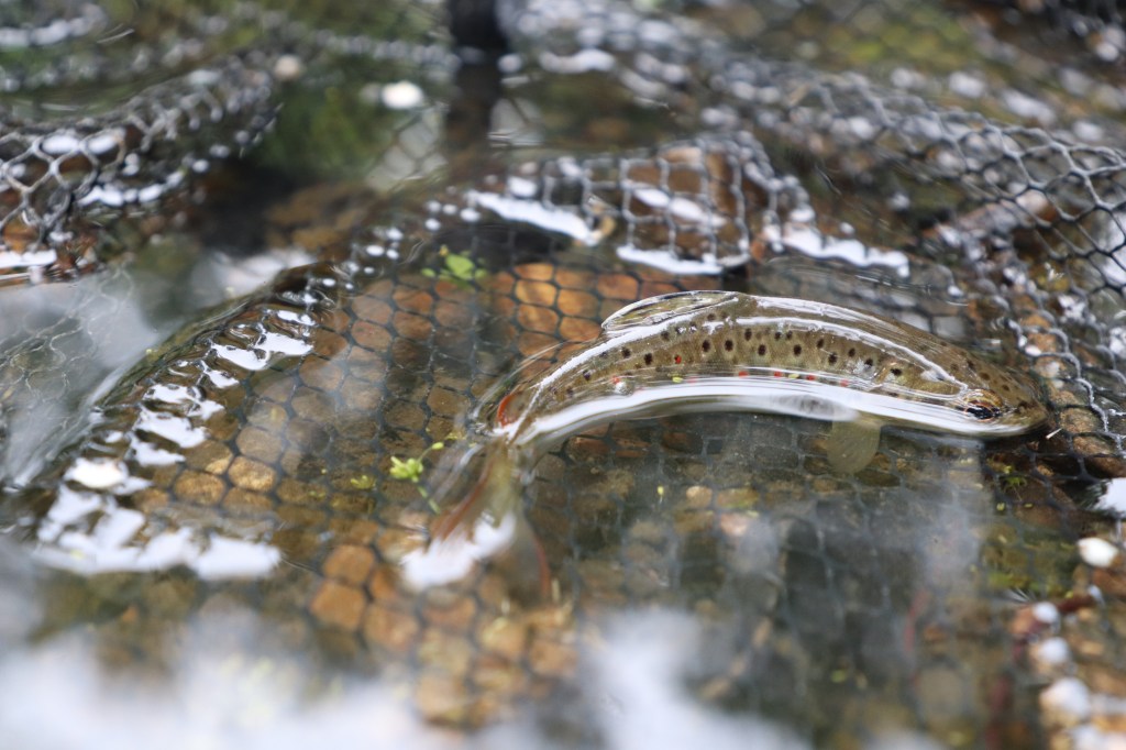 A knock on the line and a flash of colour from below the surface caught me by surprise and I lifted the rod tip sharply in panic. I hadn’t held out much hope in any fish showing interest today, much less on my first cast and in my shocked haste I had missed the subtle take. I couldn’t hear my own lamentations over the wind and rain but hopeful that I hadn’t spooked the fish with my clumsiness I recast and focused, ready for what I hoped was a second chance. With cold wet fingers I gently inched the the line through the dripping eyes on the rod and had almost come to the end of the drift when there it was again. I was not going to make the same mistake again and lifted the rod tip firmly, holding the line tight. Barely detectable head shakes vibrating up the line told me the fish was on. I would love now to write about a hard and frantic fight as I struggled to reign in a wild brown trout of epic proportions, determined to free itself from the end of my line. Unfortunately there is no amount of embellishment that could change the size of this brave little fish. At about the same length as my middle finger and with a weight measurable only in grams rather than pounds or ounces, the fish was in the net in the blink of the eye.