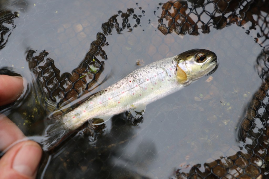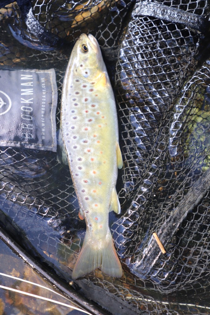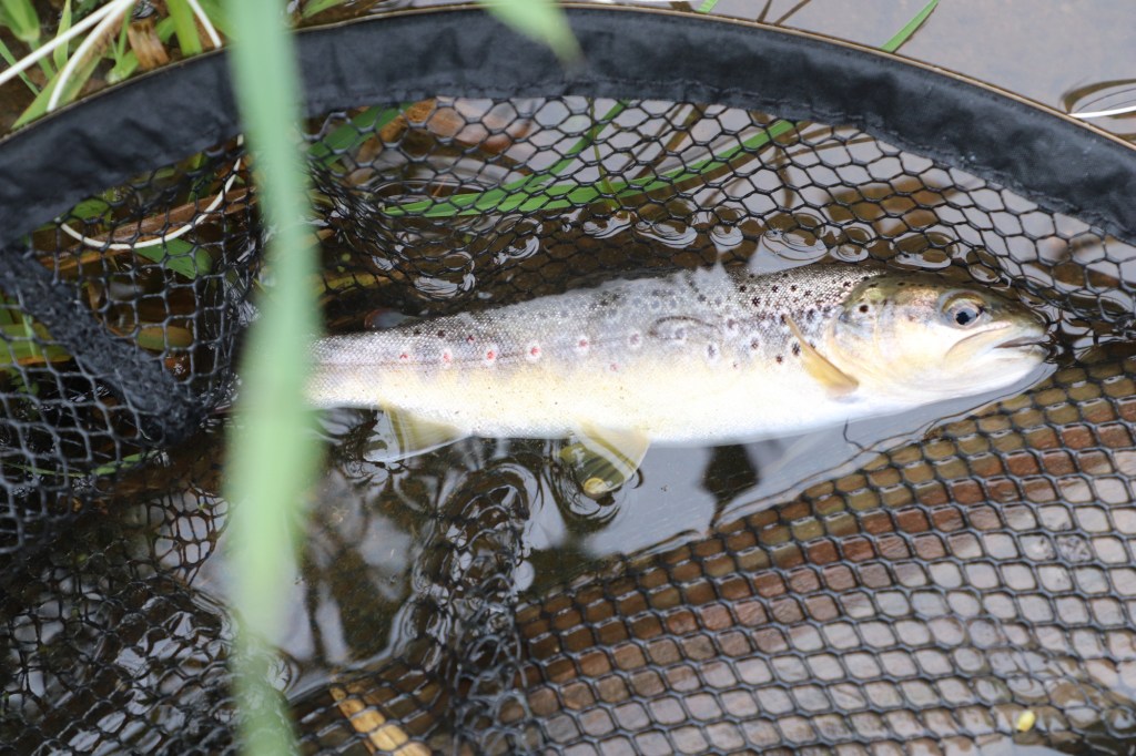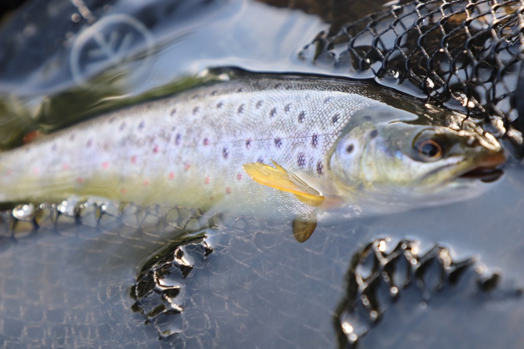 It may not have been a trophy by any means but what it lacked in size it more than made up for in its delicate beauty. Big eyes, almost too big for its skinny body, stared back at me from net, the fly had freed itself so there was no need for me to handle its tiny frame. It needed no time for recovery after the brief scrap so I took one or two pictures and directed it carefully out of the net, watching happily as he swam off quickly to do some lonely reconciliation in the safety of the deep pool. I find it encouraging when I catch small fish like this. To me it is a sign that there are still rivers and streams that are doing well and healthy enough to support the reproduction of these fragile salmonids. With so much controversy surrounding the mismanagement of our water ways perhaps these little gems are trophies in their own right, a sign that nature can prevail despite man’s often best efforts at disruption.