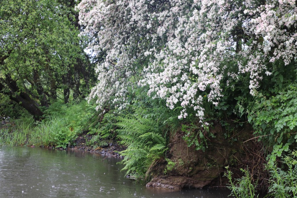 With my weather beaten morale now improved somewhat I decided to head further along river, stopping to throw a cast wherever I could along the leafy banks. A cuckoo’s call could be heard above the swaying of the trees and tapping of the rain, blown across a wind swept field from the shelter of a thick hedge. He’s left his departure South late and I suspect he is now regretting his decision. Wishing instead to be bathing in the warm light of the sun in some far off equatorial forest in Africa. Traipsing on eyes down, as I picked my way through the thick growth, I took note of the usually vibrant petals of the ranunculus, germander speedwell and red campions that splashed the verdant green banks with colour. Even they seemed dulled by the adverse weather, unlike the hawthorns dotted along the banks, with their clouds of snow white blossoms hanging over the murky water, littering the surface with petals with the relentless gusts.